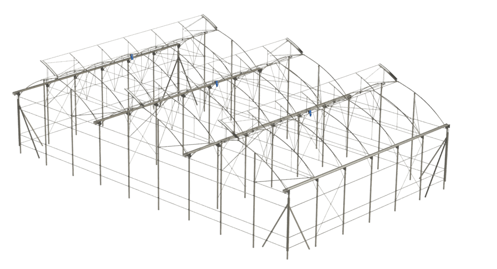 Эти преимущества дополняются эксклюзивными инновациями J. Huete Greenhouses, которые сочетают овальные трубы с новыми усиленными капитальными конструкциями и столбами сечением 100×100. Благодаря такой структурной интеграции можно добиться пролета до 4 метров без необходимости использования промежуточных стропил, что оптимизирует пространство для выращивания, улучшает вентиляцию и повышает общую эффективность теплицы.