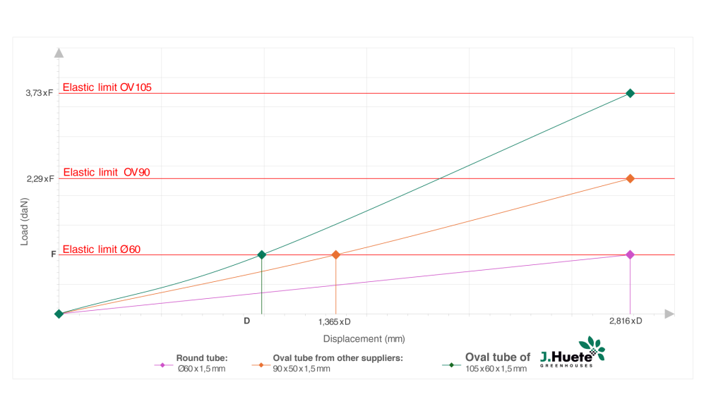 Овальная труба J. Huete Greenhouses способна выдерживать нагрузку в 3,73 раза большую, чем круглые трубы, и в 1,63 раза большую, чем другие варианты на рынке, чтобы достичь своего предела текучести.