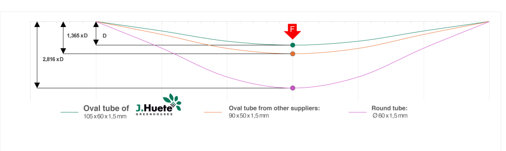 При одинаковой нагрузке овальная труба J. Huete Greenhouses имеет прогиб в 2,816 раза меньше, чем круглая труба, и в 1,365 раза меньше, чем овальная труба других марок.