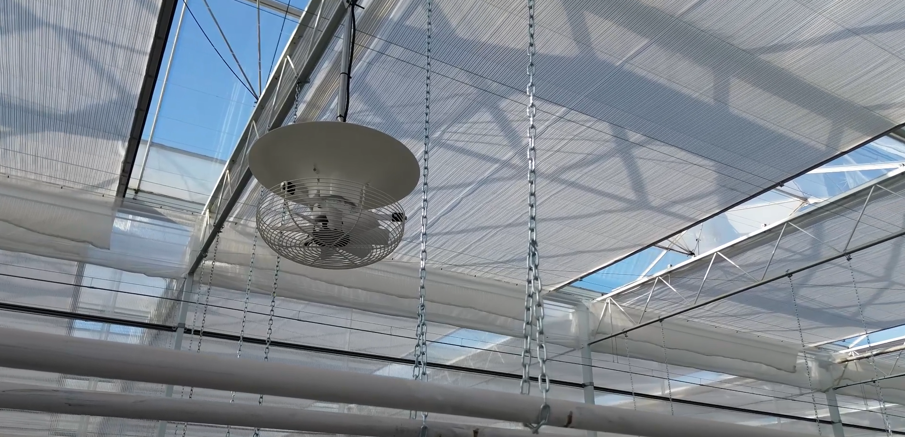 Движение воздуха будет иметь решающее значение для поддержания оптимальной среды. Мы установили горизонтальные рециркуляторы воздуха в тамбурах и вертикальные рециркуляторы внутри теплицы. Эти устройства будут создавать активный микроклимат, снижая влажность и оптимизируя затраты на электроэнергию за счет улучшения распределения воздуха. Кроме того, мы установили систему распыления под высоким давлением, известную как Fog System, которая будет поддерживать оптимальные условия влажности для выращивания малины, помогая контролировать температуру и снижая водный стресс у растений.